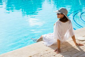 Fashion beautiful woman on summer vacation relaxing at luxury resort spa poolside. Young fashionable lady wearing sun hat and white kaftan.